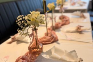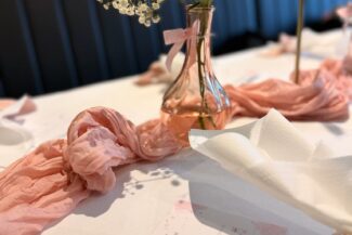 Schon beim Betreten des Raumes wurde klar: Hier wurde nichts dem Zufall überlassen. Die Tischdekoration war in zarten Rosé-und Cremetönen gehalten. Kleine Glasvasen mit weißen Rosen und feinem Schleierkraut, kombiniert mit fließenden Stoffelementen in Rosa, sorgten für eine elegante und zugleich warme Atmosphäre.