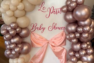 Das Highlight war die große Fotowand mit Ballon-Arrangement sowie einer großen Schleife als Blickfang. Der Schriftzug „Le Petit Baby Shower“ setzte einen wunderschönen Akzent – perfekt für Erinnerungsfotos mit Familie und Freunden.