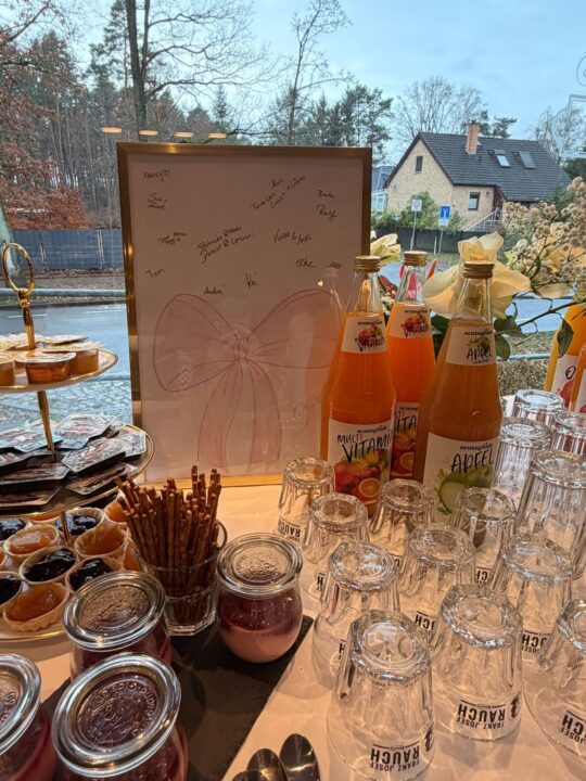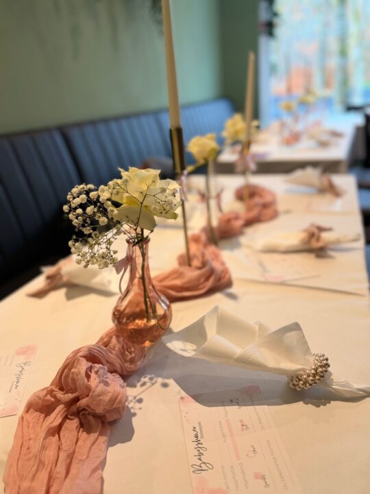 Schon beim Betreten des Raumes wurde klar: Hier wurde nichts dem Zufall überlassen. Die Tischdekoration war in zarten Rosé-und Cremetönen gehalten. Kleine Glasvasen mit weißen Rosen und feinem Schleierkraut, kombiniert mit fließenden Stoffelementen in Rosa, sorgten für eine elegante und zugleich warme Atmosphäre.