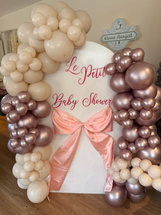 Das Highlight war die große Fotowand mit Ballon-Arrangement sowie einer großen Schleife als Blickfang. Der Schriftzug „Le Petit Baby Shower“ setzte einen wunderschönen Akzent – perfekt für Erinnerungsfotos mit Familie und Freunden.